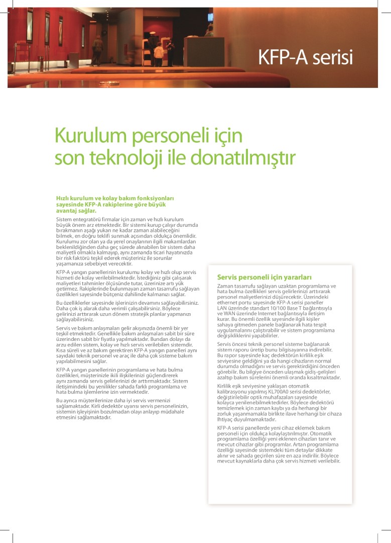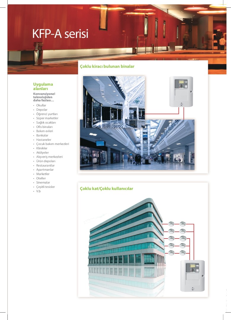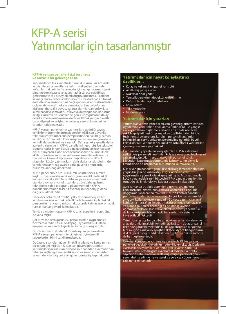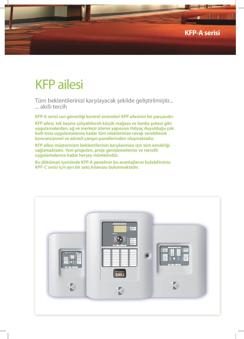 KFP-A serisi can güvenliği kontrol sistemleri KFP ailesinin bir parçasıdır. KFP ailesi, tek başına çalışabilecek küçük mağaza ve banka şubesi gibi uygulamalardan, ağ ve merkezi izleme yapısının ihtiyaç duyulduğu çok katlı bina uygulamalarına kadar tüm isteklerinize cevap verebilecek konvansiyonel ve adresli yangın panellerinden oluşmaktadır. KFP ailesi müşterinizin beklentilerinin karşılanması için tüm esnekliği sağlamaktadır. Yeni projeden, proje genişlemelerine ve retrofit uygulamalarına kadar herşey mümkündür. Bu döküman içerisinde KFP-A panelinin bu avantajlarını bulabilirsiniz. KPF-C serisi için ayrı bir satış kılavuzu bulunmaktadır.