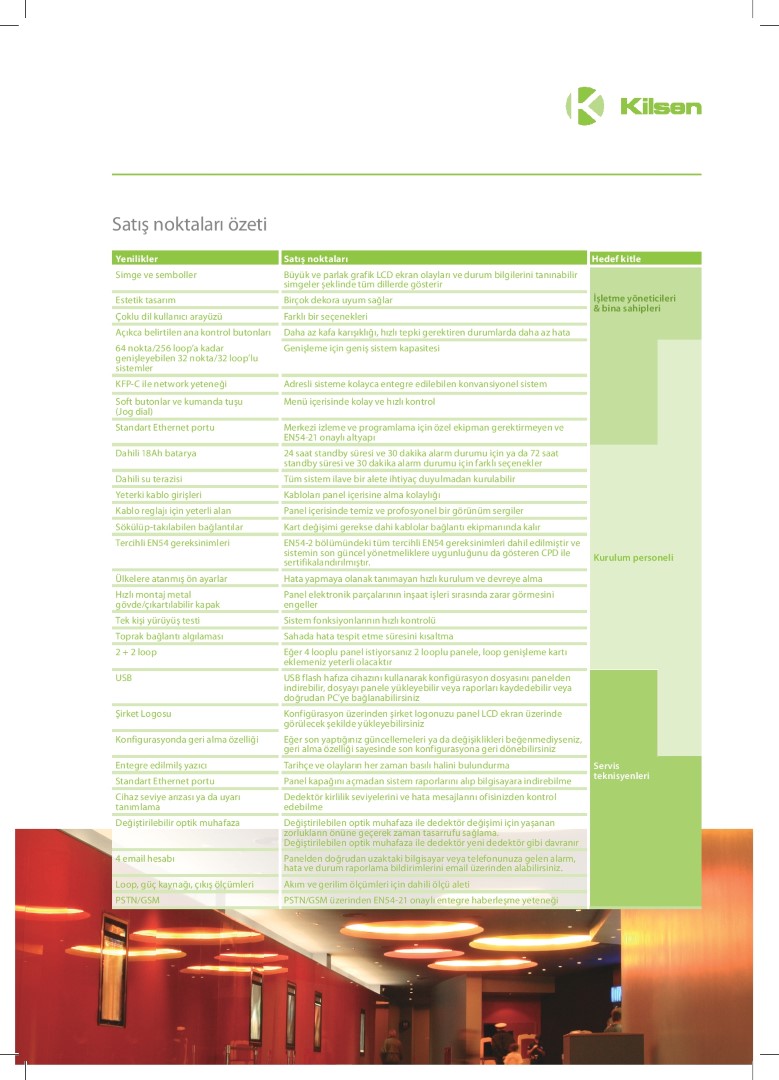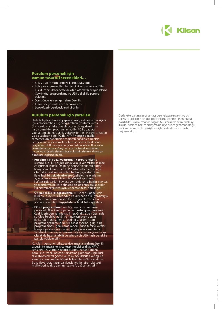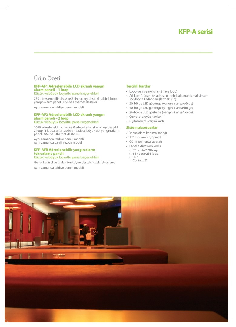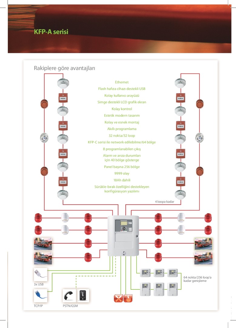 KFP-A serisi can güvenliği kontrol sistemleri KFP ailesinin bir parçasıdır. KFP ailesi, tek başına çalışabilecek küçük mağaza ve banka şubesi gibi uygulamalardan, ağ ve merkezi izleme yapısının ihtiyaç duyulduğu çok katlı bina uygulamalarına kadar tüm isteklerinize cevap verebilecek konvansiyonel ve adresli yangın panellerinden oluşmaktadır. KFP ailesi müşterinizin beklentilerinin karşılanması için tüm esnekliği sağlamaktadır. Yeni projeden, proje genişlemelerine ve retrofit uygulamalarına kadar herşey mümkündür. Bu döküman içerisinde KFP-A panelinin bu avantajlarını bulabilirsiniz. KPF-C serisi için ayrı bir satış kılavuzu bulunmaktadır.